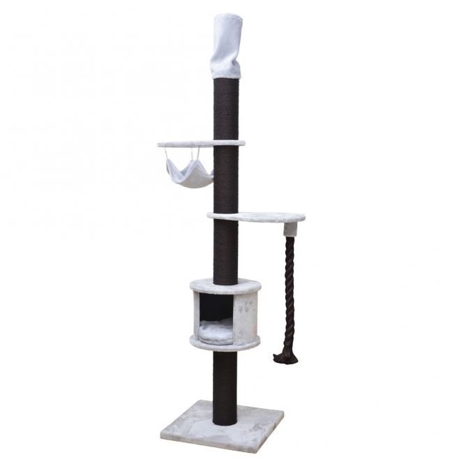 Der Kratzbaum hat alles was sich eine Katze wünscht: er ist robust dank der Befestigung zwischen Boden und Decke, man kann bis zur Decke klettern, die Sisalpfähle sind bis zu 15 cm dick, es gibt eine komfortable Hütte, 2 Plattformen, eine Hängematte oben und eine dicke Spielkordel.