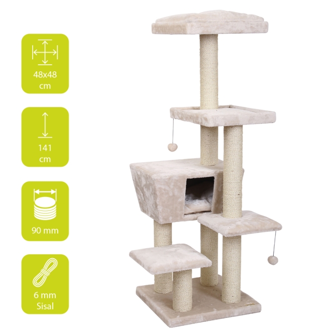 Der Kratzbaum Trend North Dakota ist ein moderner mittelgroßer Kratzbaum mit verschiedenen Liege- und Sitzbereichen sowie einem Ruhe- und Schlafhäuschen. Sehr robust und verschleißfest durch komplett verklebtes Sisal und Plüsch. Im Häuschen und auf der obersten Liegefläche ist ein weiches Kissen (Waschbar bei 30° C). Zusätzlich ist unter 2 Liegeflächen ein Spielball mit Gummiband angebracht, sodass die Katze nach Herzenslust spielen kann.